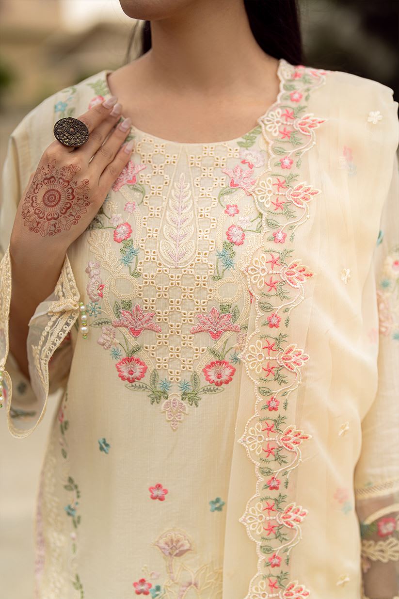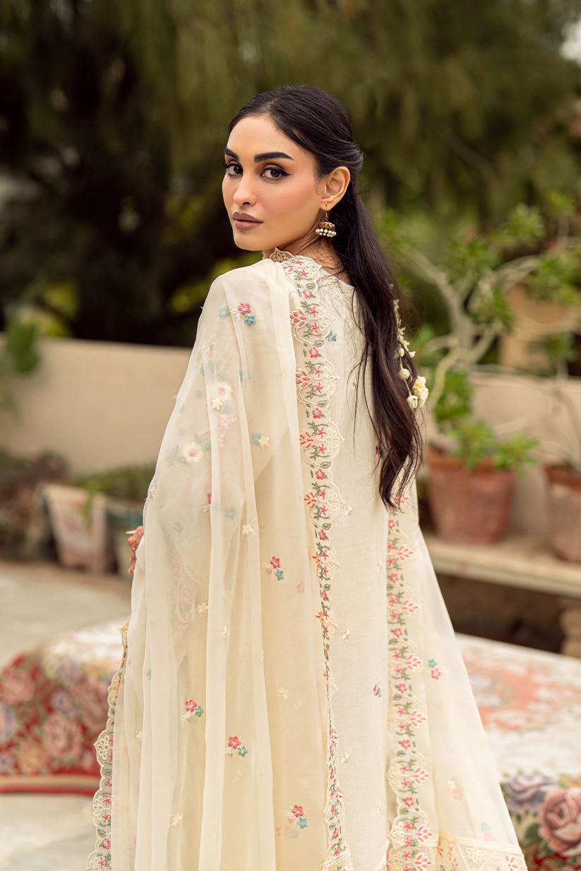 Dupatta: Elegant organza dupatta decorated with detailed 3D embroidery and embellishments, adding depth and a luxurious texture.